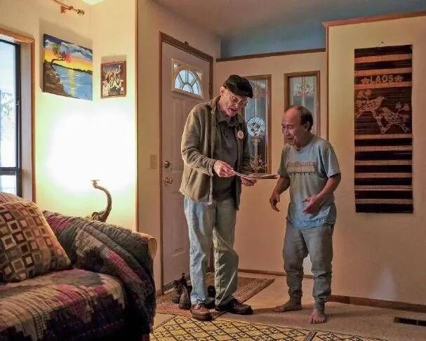 Dave Gauger drops by to visit with Singkham Souphommanichanh and hand over a newspaper clipping featuring the latter’s granddaughter, a member of the Raymond High School wrestling team.