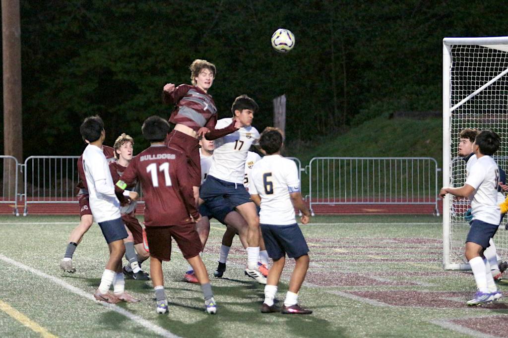 RYAN SPARKS | THE DAILY WORLD Montesano’s Peter Bruland (7) attempts a header off a corner kick during a 1-1 tie against Forks on Friday at Montesano High School.