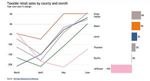 DEPARTMENT OF COMMERCE                                 This screen shot from the Department of Commerce Economic Recovery Dashboard shows the changes in taxable retail sales in Grays Harbor and surrounding counties between the beginning of the pandemic in March and June.