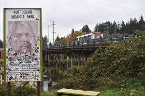 A view of Kurt Cobain Memorial Park shows a Grays Harbor Transit bus as it rolls north across Young Street Bridge. While the park shouldn’t receive an impact from any potential bridge replacement, the bridge itself may go away in the next few years. The city hired consultants in September. Some of the consultants’ preliminary investigative work begins Monday. The work will cause lane closures on Young Street.