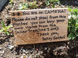 The wooden sign Betsy Seidel, of Hoquiam Crime Watch, left near a flower box that got vandalized at the city line between Aberdeen and Hoquiam. Seidel doesn’t want people to get discouraged since 99% of people seem to appreciate the flowers.