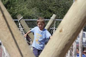 Cub Scout Jaxon Astry crosses a monkey bridge set up by the Scouts during the Grays Harbor County Fair. (Michael S. Lockett / The Daily World)