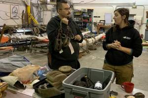 Crew member James Hsu, left, discusses treatment of one of Lady Washington's blocks with Captain Halee Grimes. (Kat Bryant | The Daily World)