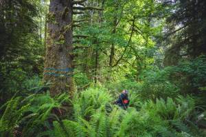 A hiker gazes at an old Sitka spruce on Washington Department of Natural Resources land included in the “Doc Holliday” timber sale on the Olympic Peninsula last summer.