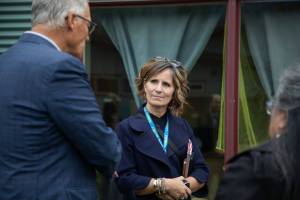 Ferndale Superintendent Kristi Dominguez, center, speaks with former Gov. Jay Inslee in September 2023. Dominguez is one of 20 Washington superintendents trying to reshape the state’s school funding system.