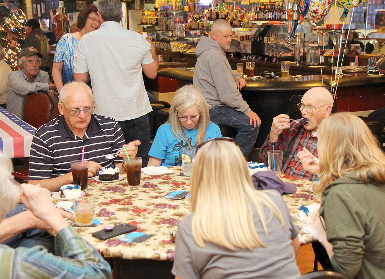 Grant Edwards, right, takes a bite of his 100th birthday cake Saturday during a celebration at the Veterans of Foreign Wars hall in Montesano, where Edwards is a lifetime member. Edwards was born May 3, 1919, in Great Falls, Montana. He enlisted in the U.S. Navy on Dec. 11, 1939. During his 20-year Navy career, Edwards was stationed in San Diego, where he was in Hospital Corps School, and in Bremerton aboard the USS Hendry attack transport. He has also lived in Aberdeen, Camp Pendleton, California, and in El Toro, California. He transferred to the Navy Reserve on Aug. 1, 1960.