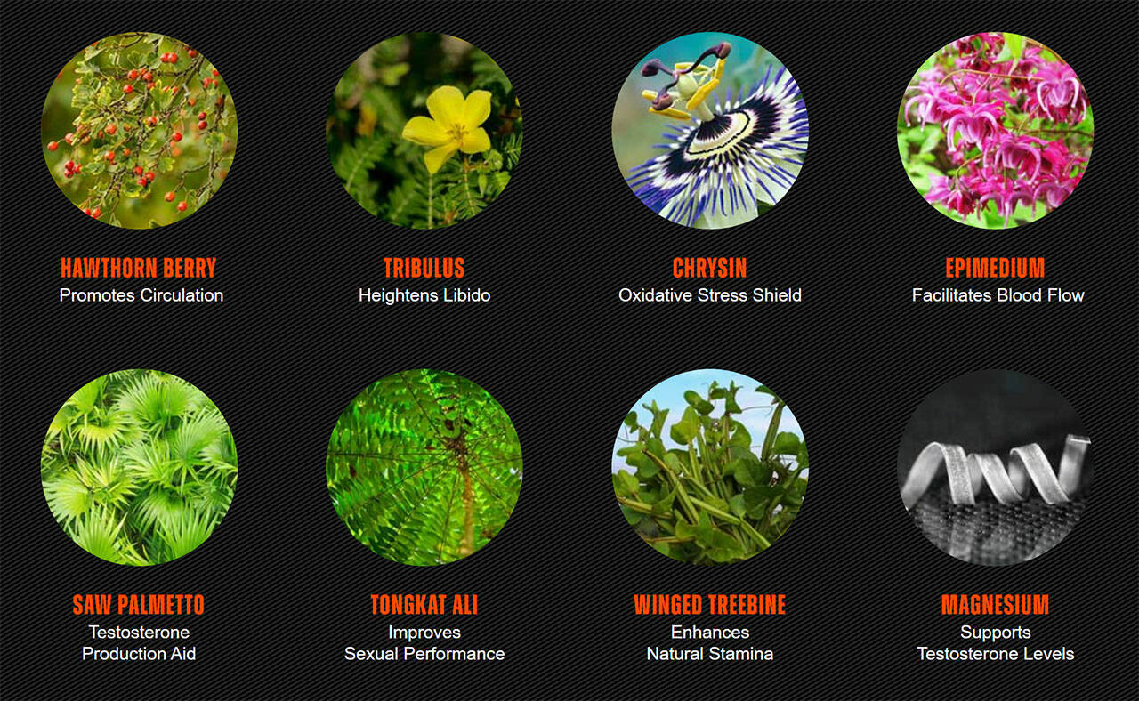 Primary Ingredients: Hawthorn berry, Tribulus, Chrysin, Epimedium, Saw Palmetto, Tongkat Ali, Winged Treebine, Magnesium