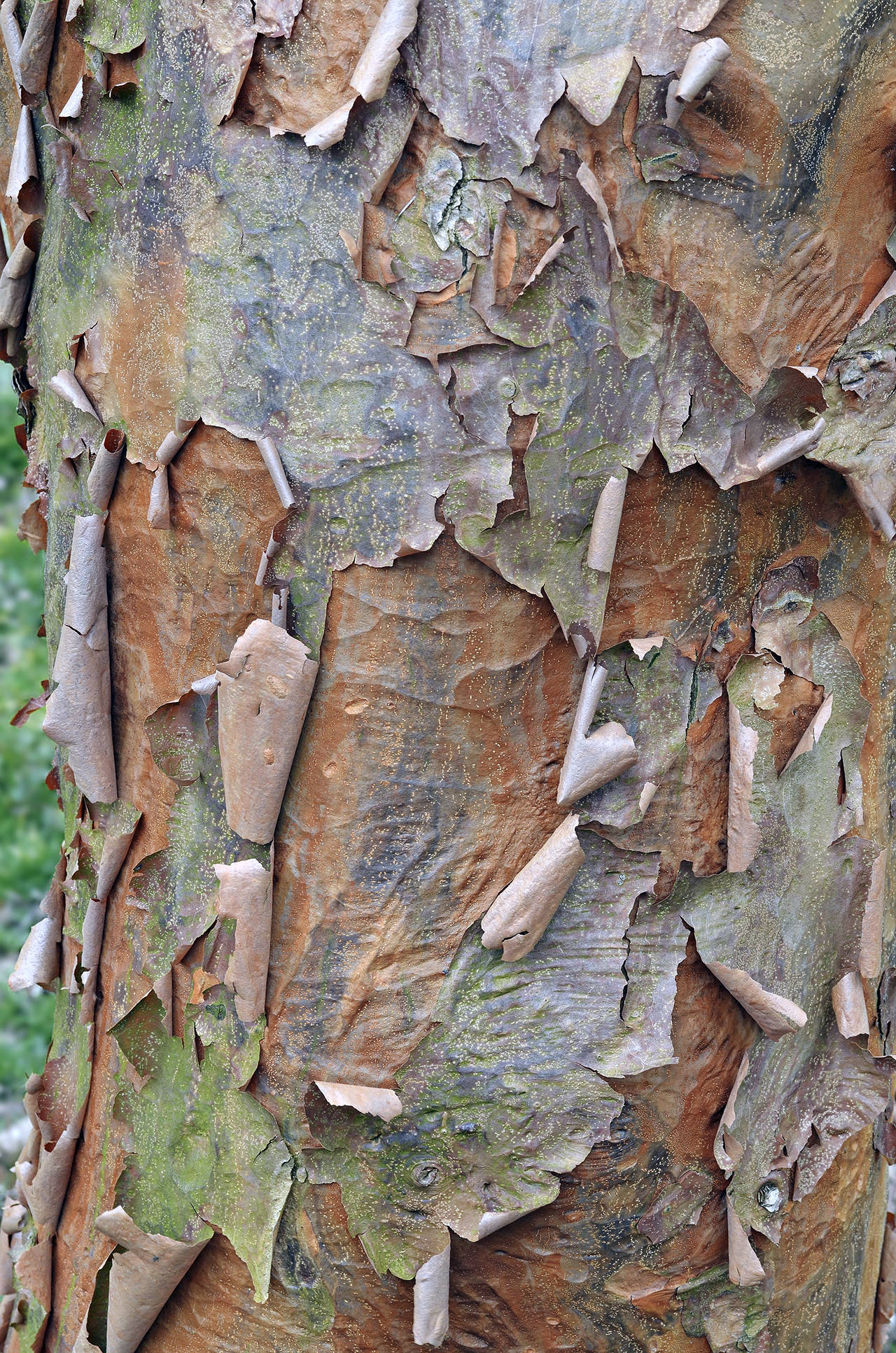 A. griseum (paperbark maple) has bare branches, and the main trunk in winter has reddish bark peeling in very thin paper sheets. The dark green leaves turn brilliant red in fall.
