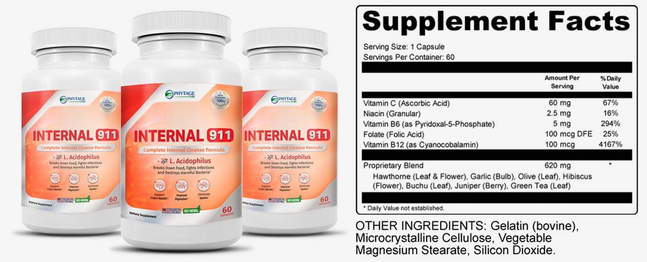 - Action #2: Internal 911 eliminates and removes bad toxins. Internal 911 claims to support your body’s natural elimination processes. That means fewer toxins floating through your bloodstream – and less toxic buildup in your gut.