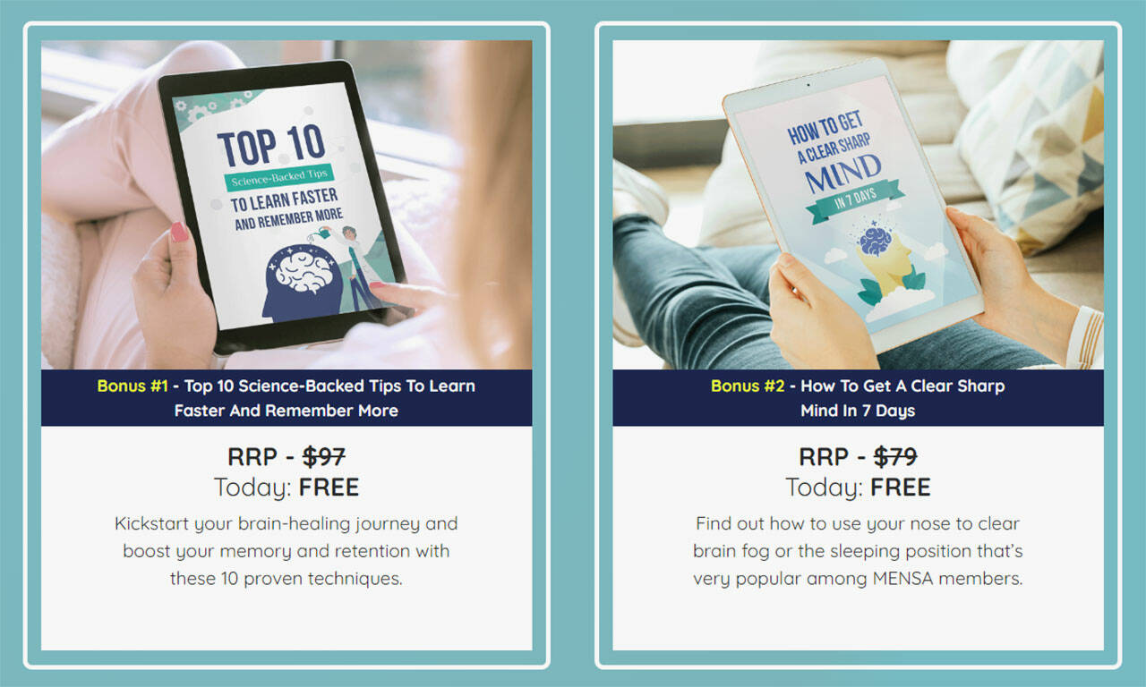 Free Bonus eBook #1: Top 10 Science-Backed Tips to Learn Faster And Remember More: You can supercharge your memory by making small changes to your diet and lifestyle habits. In this eBook, you can discover the best changes to make to kickstart your brain-healing journey, boost memory and retention, and enhance your brain using science-backed strategies. It’s valued at $97 and available for free with all 3 and 6-bottle purchases of NeuroTonix.