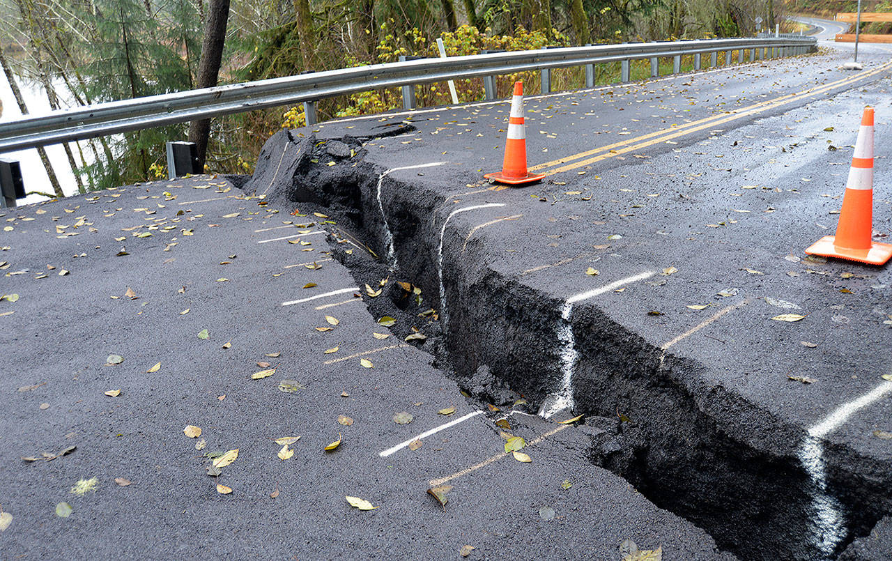 Blue Slough Road runs about five miles between State Route 107 and Highway 101 and is used as an alternate route for those traveling between Montesano and Cosmopolis. The site of the problem is about three miles east of Cosmopolis, where the road has been split south to north all the way across. The roadway on the east side of the crack in the road now sits about a foot or more above the roadway to the west and more cracks are forming a few yards away.