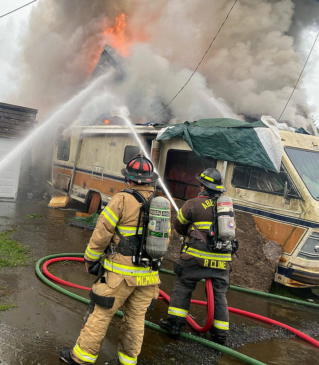 ”Upon arrival, units found a 1.5 story house with a large amount of smoke venting from the roof with heavy fire venting from the attached garage,” said Aberdeen Battalion Chief Kelly Niemi. “A motorhome parked next to the structure was also on fire. The fire had spread to an adjacent occupied home causing damage to the siding, which was quickly extinguished as part of the initial on-scene operations.”