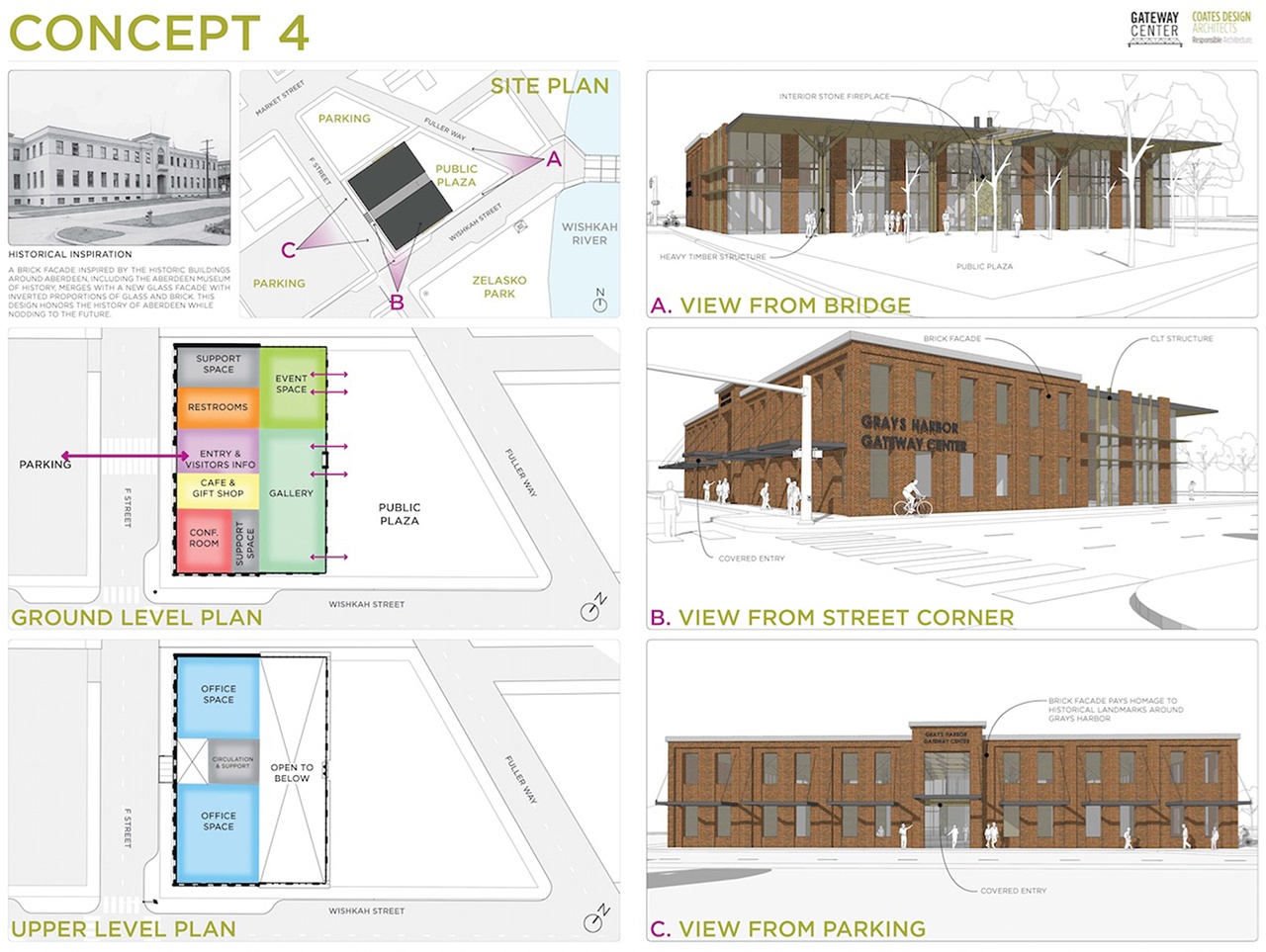 Plans for the design of the Gateway Center continue. Public meetings allowing residents to indicate preferences in the design of the building, which will be located at the intersection of Wishkah and F streets in Aberdeen, occurred in the fall. Architects have narrowed it down to four potential styles.