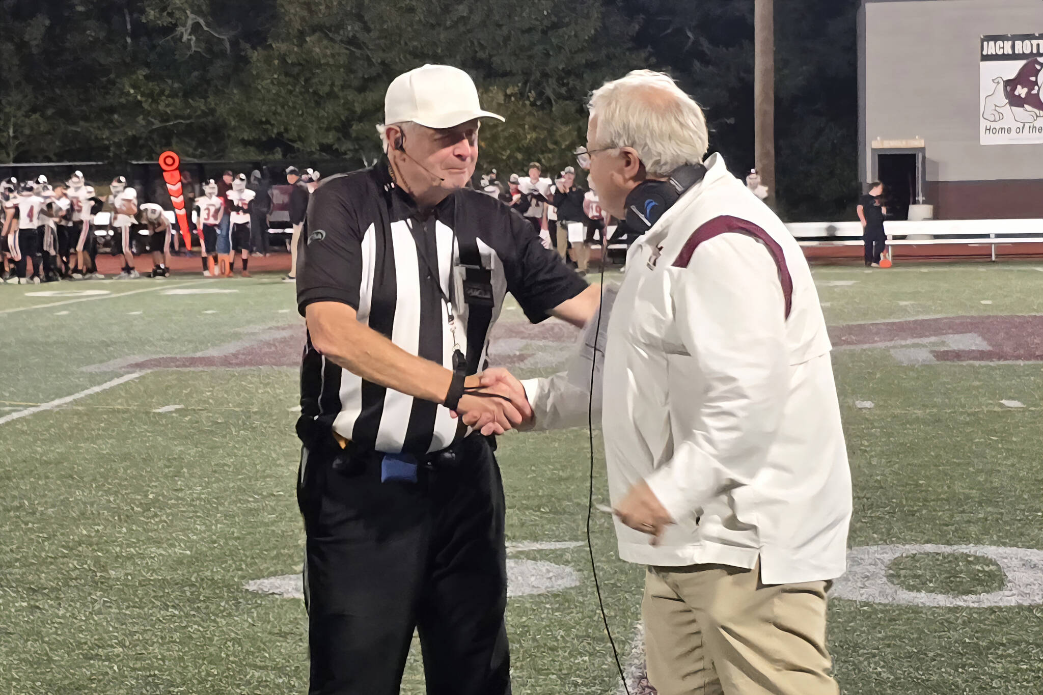 Before the start of the second half at Friday’s homecoming game, Montesano honored head referee Terry Simmons, who is in his final season of calling games on the field.