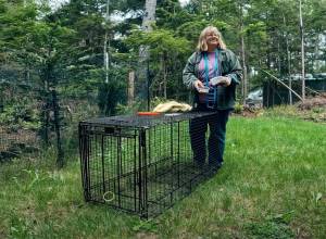 Vivian Dahlin, who runs Operation Dog Rescue, a free service for finding lost pets based in Ocean Shores, stands next to one of her cage traps during a video shoot with North Beach TV in 2023. Dahlin says the use of traps baited with food, which are strictly prohibited under city code, are the most effective way to rescue lost dogs.