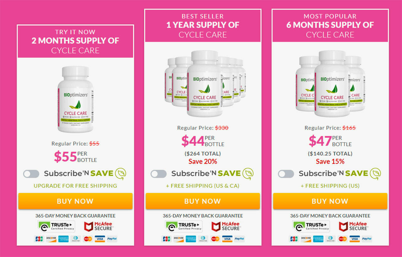Cycle Care is priced at $55 per bottle. Each bottle contains a 2-month supply of Cycle Care or 90 capsules. You can also “subscribe and save” to reduce the price to $49 per bottle or less.